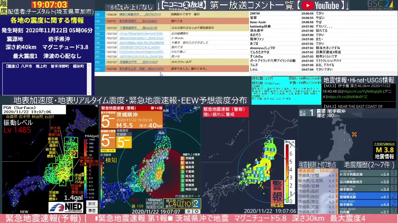 緊急地震速報 2020年11月22日19時06分 茨城県沖 M5 7 深さ45km 最大震度5弱 音量注意 ニコニコ動画